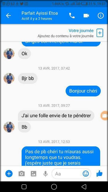Cette affaire date de quelques semaines déjà. Il y a un certain Patrice Nouma que je ne connaissais ni d’Adam ni de Caïn, mais qui s’est réveillé un matin et qui a balancé que « Parfait Ayissi est un pédophile ! » Et pour étayer ses déclarations, il a effectué une publication qui frisait à la fois le salace et le rocambolesque. Il nous a dit que Parfait Ayissi flirtait couchait avec une petite orpheline de 17 ans qui rêvait de devenir une journaliste, et qui habitait dans la bourgade d’Obala. Il nous a « révélé » que ces deux-là se mélangeaient partout-partout dans les partouzes : au bureau oooh, au snack oooh, à l’auberge oooh, dans le domicile de l’imparfait Ayissi quand son épouse n’était pas là oooh….
