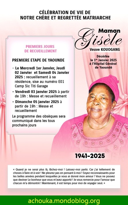 C’était une maman que personne ne détestait. Elle aura eu une vie pleine, remplie d’épreuves mais aussi de beaucoup de réussites. Elle était du genre à ne jamais se plaindre (c’est elle qui m’a appris cela), elle avait toujours le regard lointain, elle avait connu les difficultés du Cameroun sous l’époque du maquis puis de la décolonisation. Et malgré tout cela, Maman Gisèle avait quand même réussi sa vie au-delà de ses espérances. Et je crois aussi qu’elle méritait amplement d’aller tranquillement se reposer.